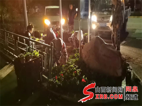 在主干道绿化带旁,工作人员们身着统一迷彩服,佩戴标识袖章,昼夜接力投入工作。工人蹲在圆形花坛中精心调整植物布局,从朝阳初升到华灯初上,装运花箱、修剪枝叶、栽植新苗的身影随处可见,展现高效协作。