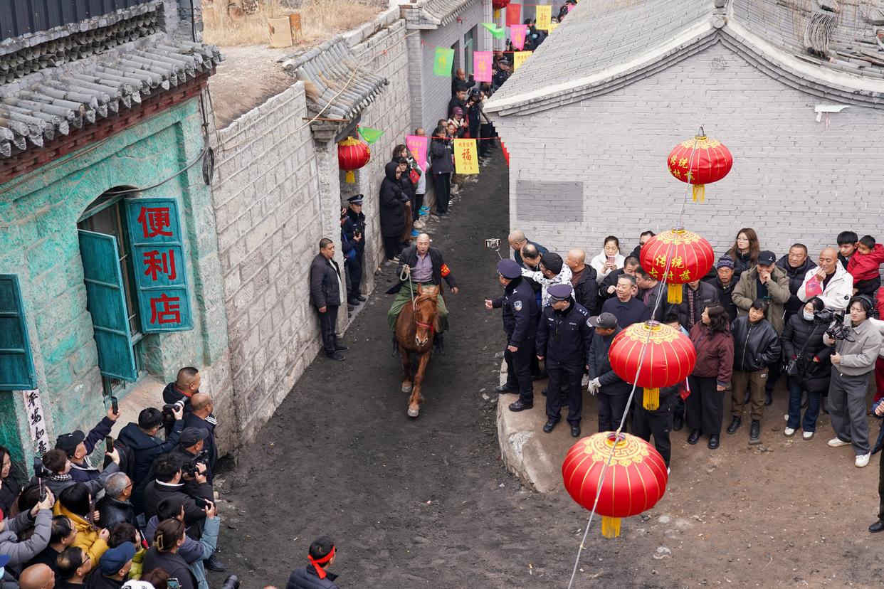 3月4日,农历正月十六,这个距离娘子关仅6公里的小山村,迎来了一年中最热闹的时刻,村中那条长约400米、宽不足4米的青石古巷上,里三层外三层挤满了人。沿路民房的台阶上、门槛上,甚至屋顶上,都早已站上了不请自来的看客,主人家却也毫不在意:“今天这个大日子,大家一起热闹热闹!”