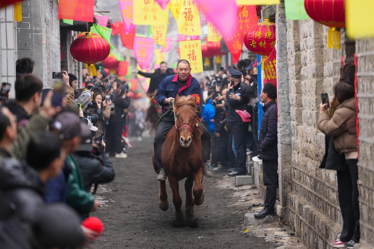 “来了来了!”不知谁喊了一句,刚刚还是人挤人的巷子,立刻闪出一条一米多宽的通道,五匹骏马前后奔出,伴随着吆喝声、锣鼓声、助威声,这条巷子瞬时沸腾了起来,跑马排——这项传承千年的春节民俗,也到了最高潮的时刻。